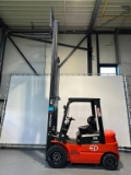 New type EP EFL 252X with triplomast 4800mm with freelift and integrated sideshift. 4th function with hoses to forkboard. Led lighting and street lighting and bleuspot. Headroom 2.21 meters. With exchangeable battery and built-in charger on 220 volts. Separate extra battery available with charger so that you can work with 1 battery and 1 battery on the charger.