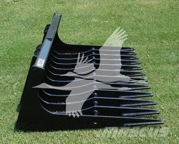 Description: 68" wide, 1/2" tines with 4†spacing Constructed with ½" high tensile steel Unique well design allows dirt to fall through while digging additional rocks, stumps, or other debris ½" high tensile steel cutting edge design distributes force among all tines Universal and Euro attachments standard, other attachments available