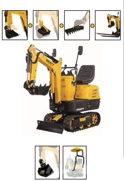 Posiadamy dodatkowy osprzęt wykonany do pracy z tym modelem. Cena zależna jest od wyposażenia minikoparki. Minikoparka wyposażona jest w ramię skrętne, które jest dodatkowo płatne. Wydajność pompy hydraulicznej 2 x 9 L/min.